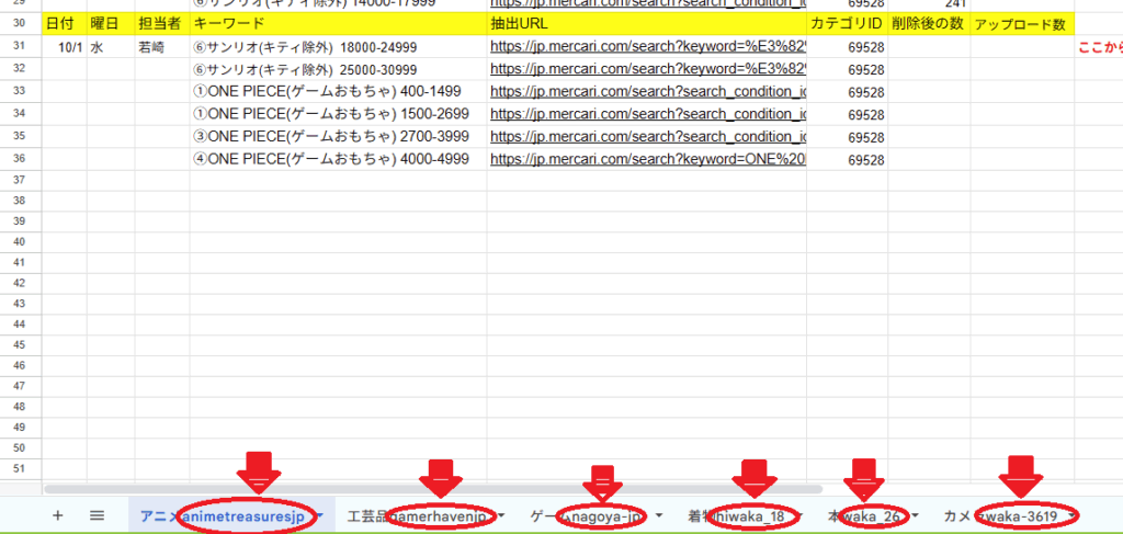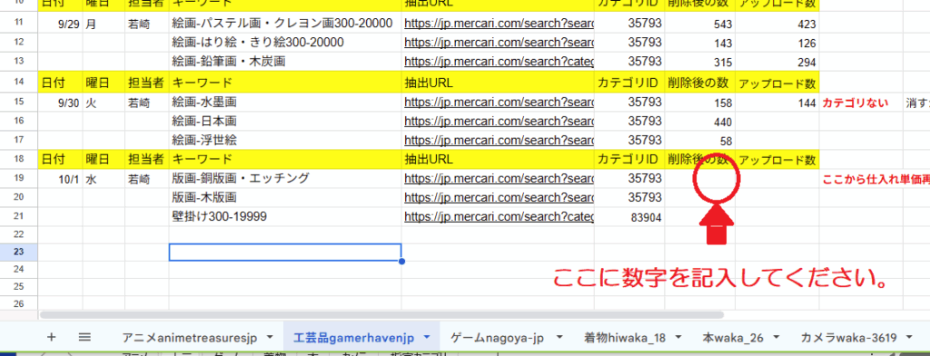 お渡ししているマニュアルに従い削除作業を終えたらスプレットシートの[削除後の数]の欄に数字を記入してください。